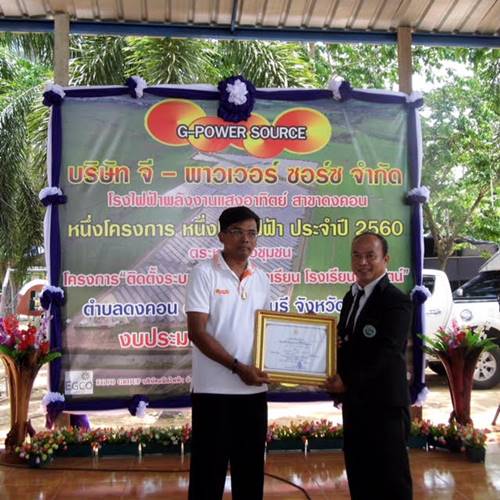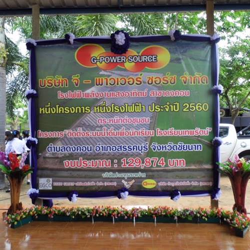 On June 29, 2017, Mr. Phongsaphat Khetdee, Assistant Manager of Power Plant Operation and Maintenance, together with the team, the representative of G-Power Source Company Limited (one of the subsidiaries of GUNKUL group) organized the project "Drinking Water System Installation for Students" at Thepparat School, Dongkhon Sub-District, Sankaburi District, Chainat Province. This project was one of projects for the communities around the Power Plant.